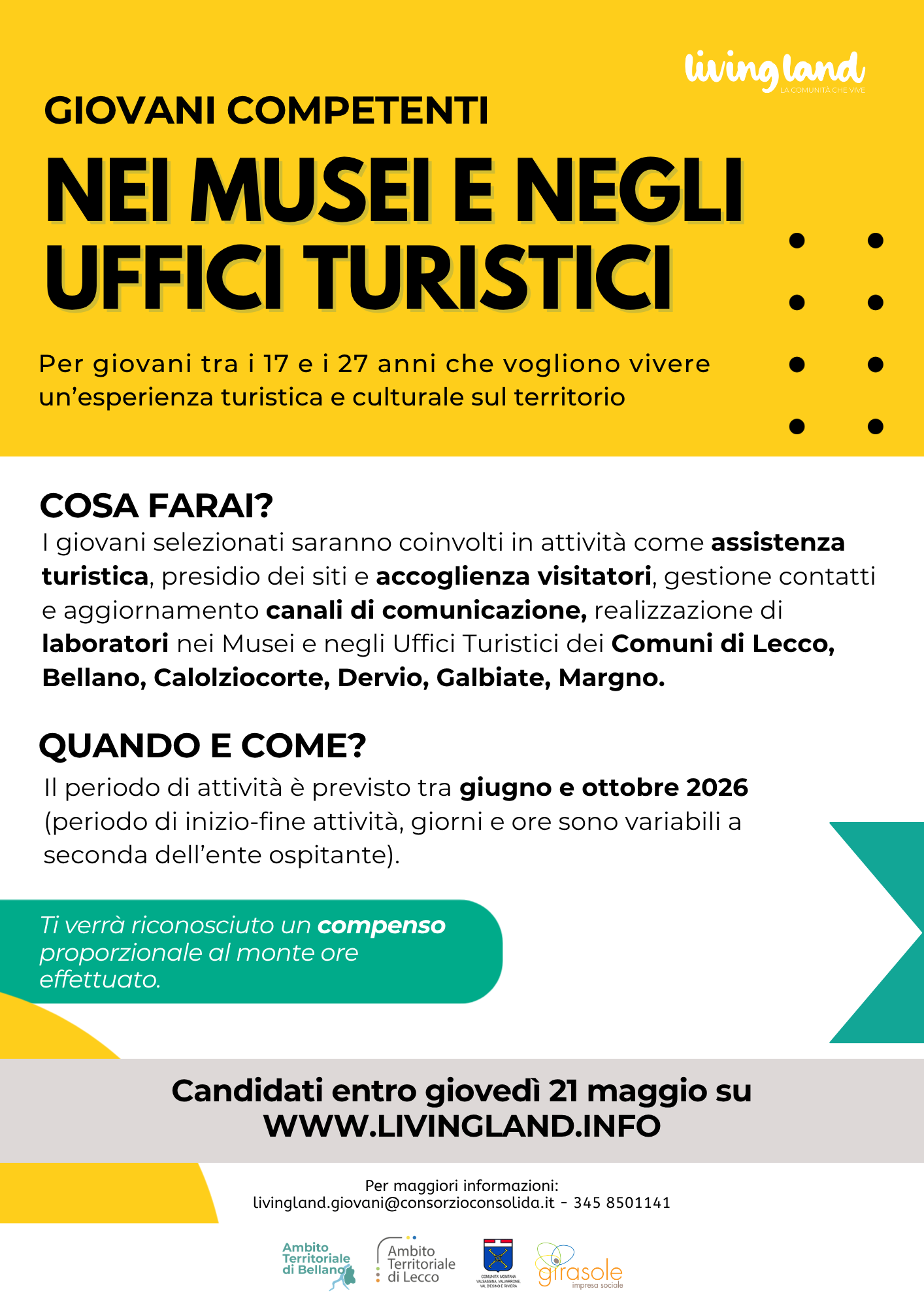 I giovani selezionati saranno coinvolti nelle attività dei Musei e degli Uffici Turistici di Lecco, Bellano, Calolziocorte, Dervio, Galbiate, Margno.
